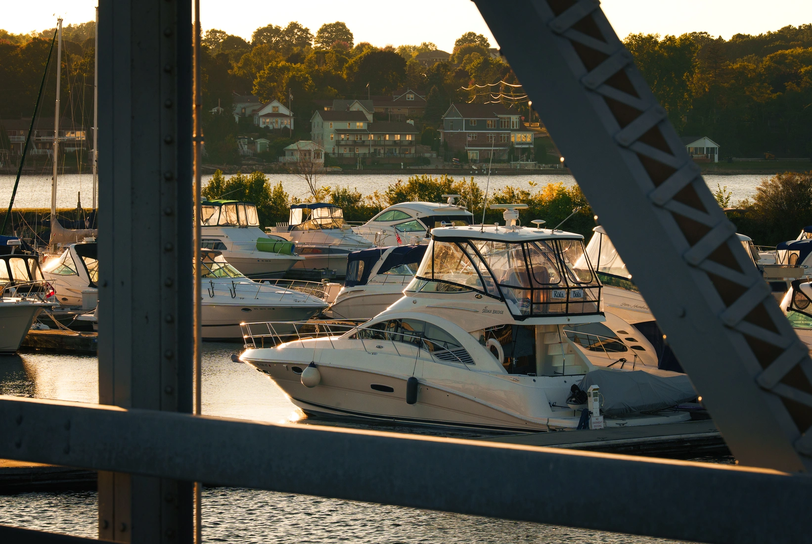Tug John Purves at Maritime Museum, with historic steel bridge in background, Sturgeon Bay